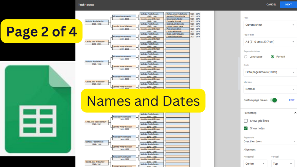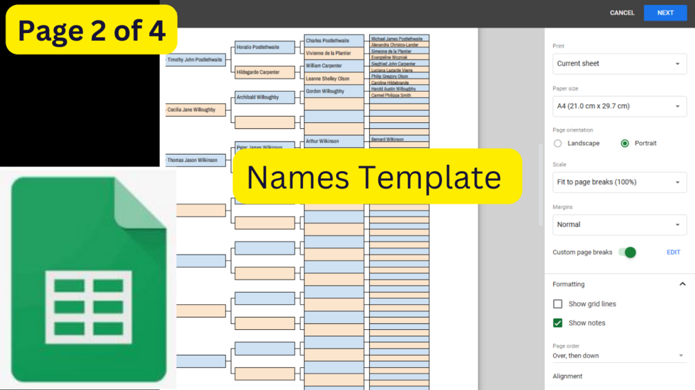 Two worksheet templates for creating and printing a ten-generation pedigree family tree in Google Sheets: