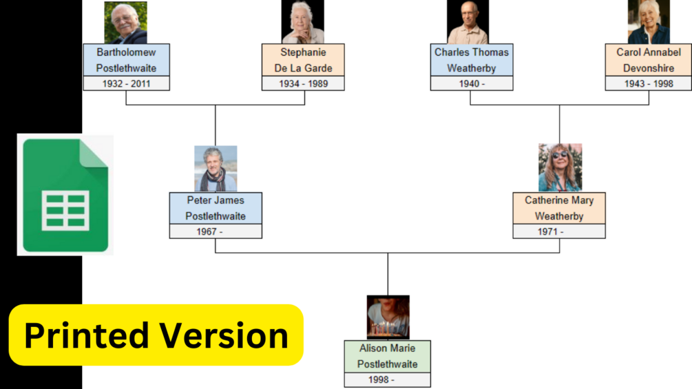 Eight worksheet templates for creating and printing three-generation family trees in Google Sheets.