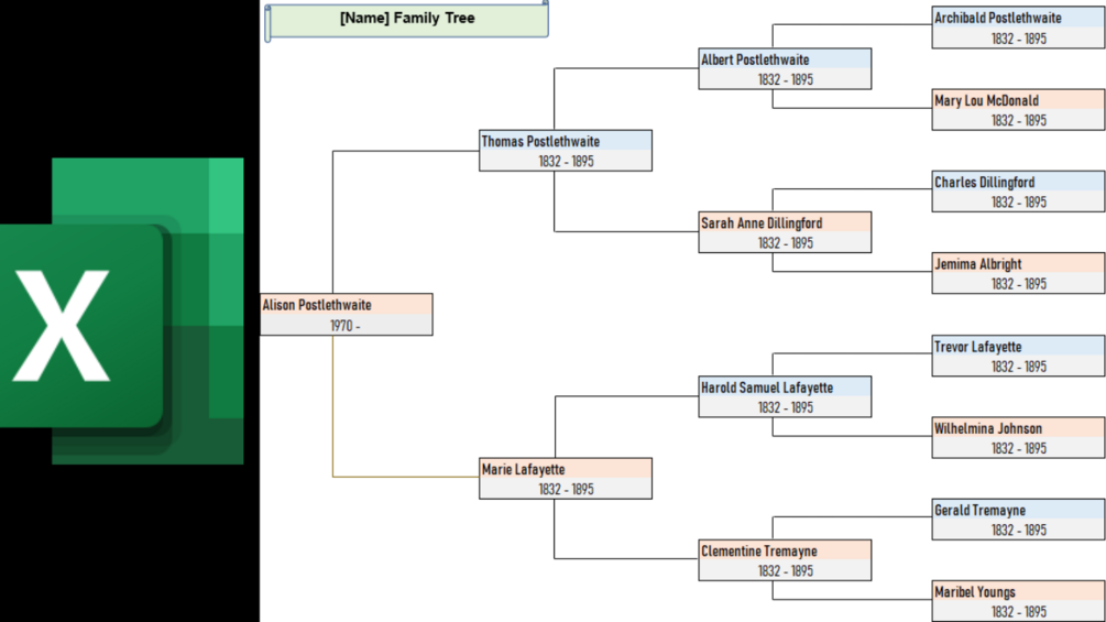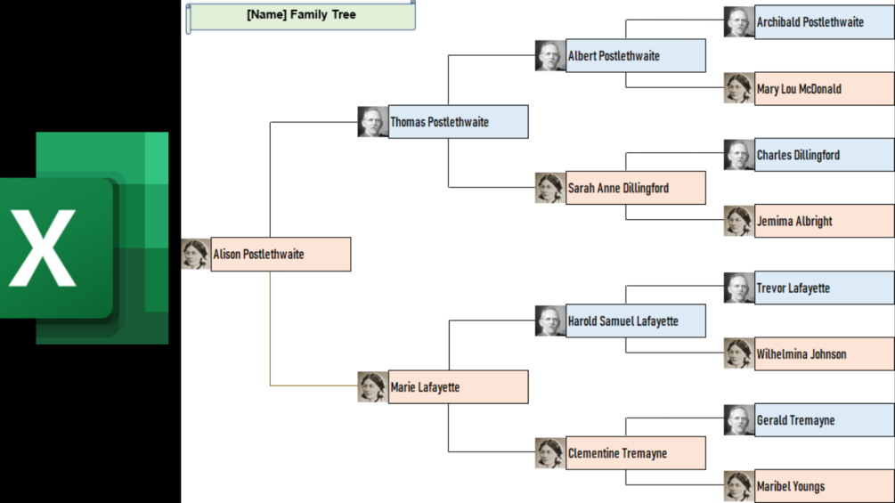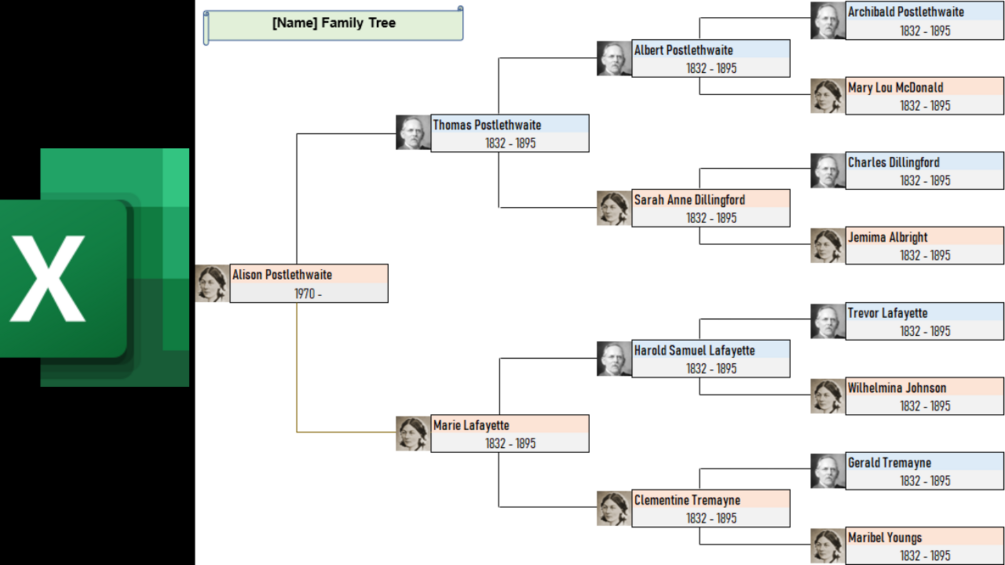 Four templates for creating and printing a four-generation pedigree family tree in Excel: